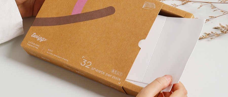 twiggy的品牌理念旨在通过日常用品让人们重新建立与自然的联系。首款产品twiggy洗衣片,不仅洗涤效果卓越,更在包装上做了革新,采用FSC认证的可持续牛皮纸,摒弃了塑料成分。这种创新包装不仅可再利用和回收,而且每盒洗衣片能减少约两个1.2公斤的洗涤瓶消耗,以及减少大量液体运输,显著降低了对环境的负担。